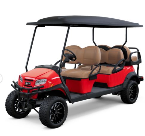 New 2026 Club Car Onward 6 passenger, Lifted, Gas, color: Rally Red, seats: Premium Camello, top: Long Black, passenger side front canopy grab handle, Front LED headlights with LED accent running lights, rear LED tail & brake lights, front & rear turn signals, fuel meter & horn, USB-A, USB-C, uncommon key 1A, front cup holders, upper center glove box storage, lower center storage with LH & RH wireless charging pads, LH & RH side storage glove box doors, Comfort grip / premium consumer steering wheel, under front seat storage tray, middle row cup holders, front and rear fender flares, 14” Gloss Black and Machined Zeus Wheel with 215/50R-14 Steel-Belted Radial Klever Tire and brush guard. $18,517.00
