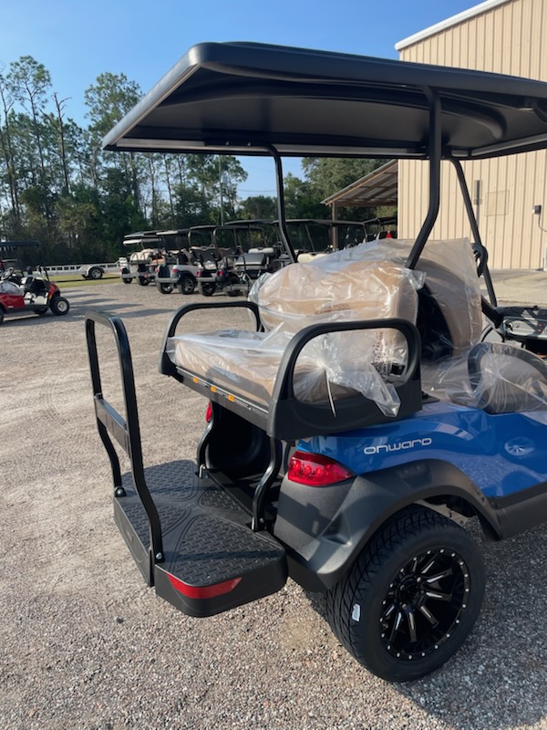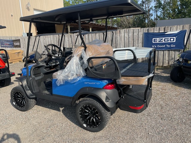 New 2026 Club Car Onward 4 passenger, Lifted, Gas, color: Metallic Brilliant Blue, seats: Premium Camello, top: Long Black, passenger side front canopy grab handle, factory front LED headlights with LED accent running lights, rear LED tail & brake lights, front & rear turn signals, fuel meter, hour meter, horn, USB-A, USB-C, front cup holders, upper center glove box storage, lower center storage with LH & RH wireless charging pads, LH & RH side storage glove box doors, premium comfort grip steering wheel, uncommon key: 1A, front and rear fender flares,14″ Gloss Black Zeus Wheel – 215/50R-14 Morpheus Steel-belted Radial Tire and brush guard. $14,297.00