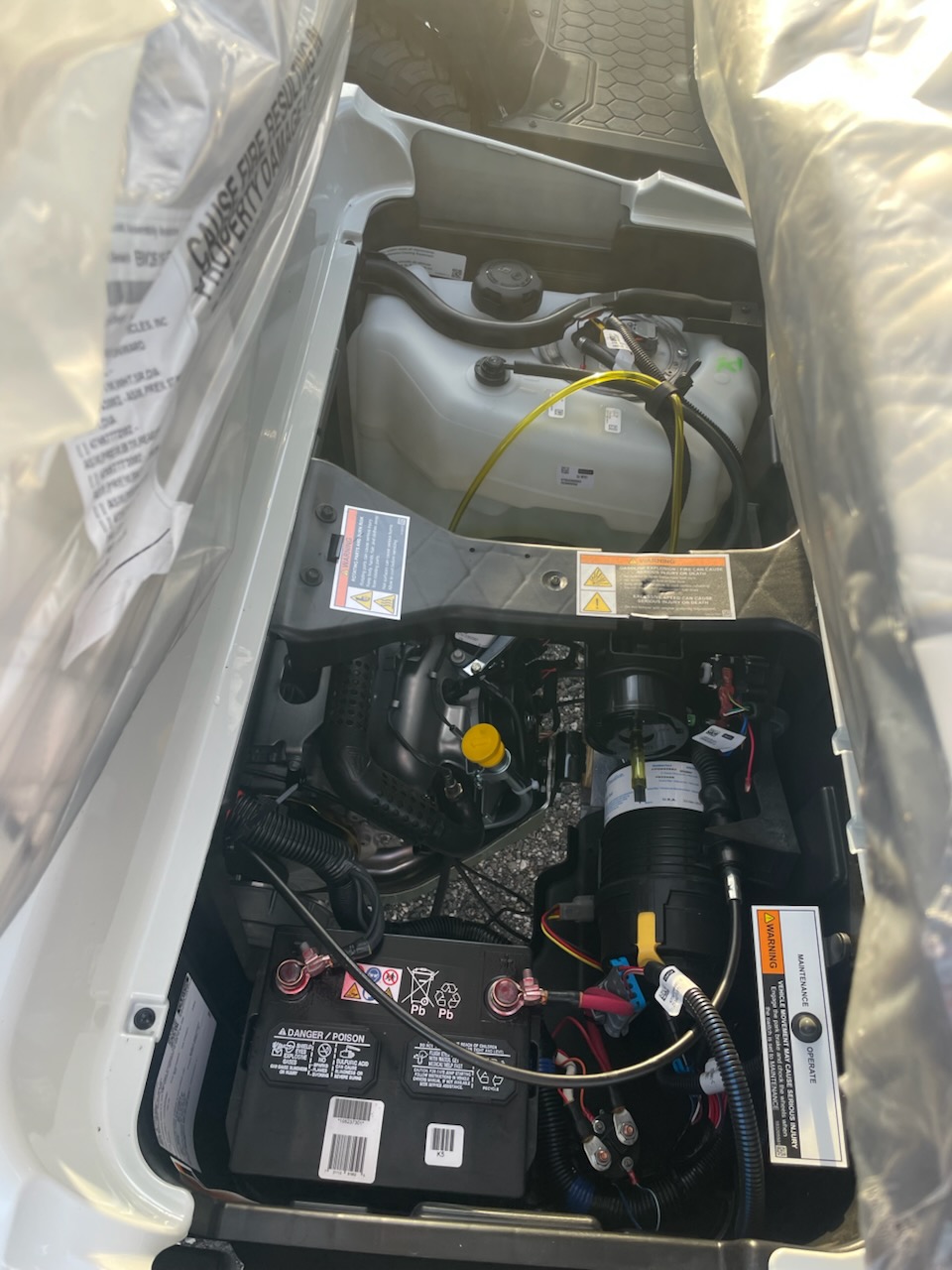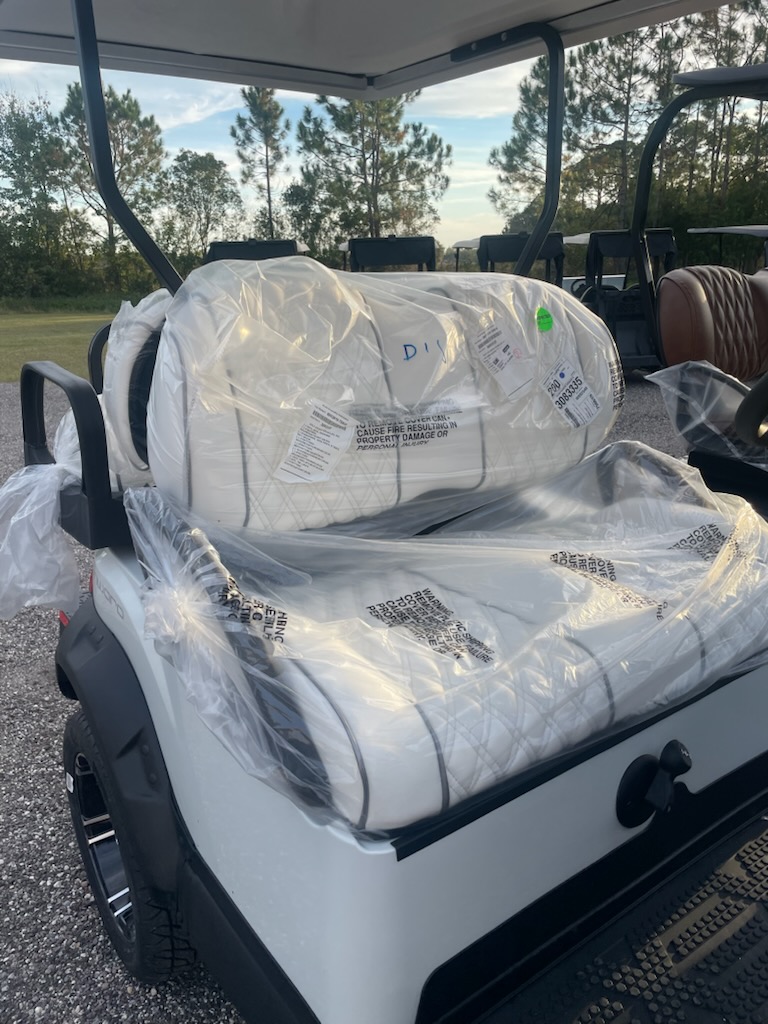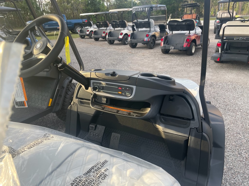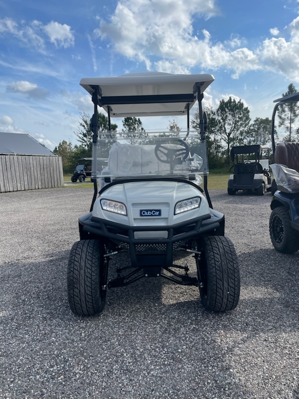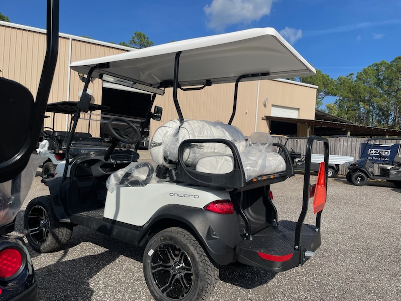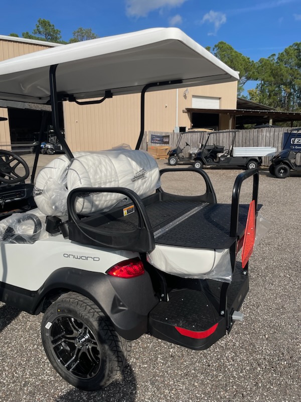 New 2026 Club Car Onward 4 passenger, Lifted, Gas, color: Metallic Glacier White, seats: Elite Bright White with Double Diamond Silver Rush Stitching and Piping, White Canopy Top with passenger side front canopy grab handle, Front LED headlights with LED accent running lights, rear LED tail & brake lights, front & rear turn signals, reflectors, parking brake, fuel meter, hour meter, horn, comfort grip premium consumer steering wheel, standard instrument panel, upper center storage glove box, lower center storage LH & RH wireless charger, driver side and passenger side storage glove box doors, DOT windshield, wiper, side mirrors, 5 panel rear view mirror, seat belts, smv, license plate light, heavy duty premium floormat, 14″ Gloss Black Mercury wheel – 215/50R-14 Steel-Belted Radial Morpheus Tire, front and rear fender flares and brush guard. $16,411.00 + Tax, Tag, Title.