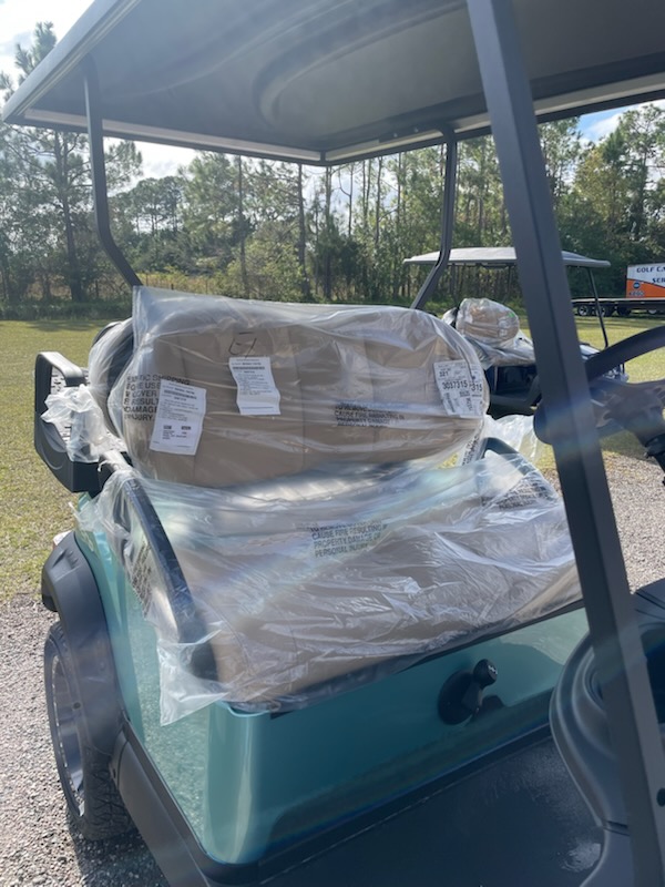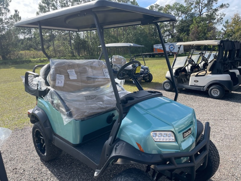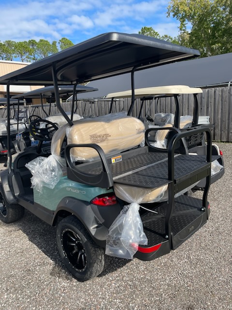 New 2026 Club Car Onward 4 passenger, Lifted, Gas, color: Metallic Sea Foam, seats: Premium Light Beige, canopy top: Long Black with passenger side front canopy grab handle, Factory Front LED headlights with LED accent running lights, rear LED tail & brake lights, front & rear turn signals, reflectors, parking brake, fuel meter, hour meter, horn, USB-A, USB-C, front cup holders, premium consumer steering wheel, standard instrument panel, Upper Center Storage Glove Box Door, Lower Center Storage LH & RH Wireless Charger, Side Storage Glove Box Doors, standard floormat, front and rear fender flares,14″ Gloss Black Zeus Wheel – 215/50R-14 Morpheus Steel-belted Radial Tire and brush guard.