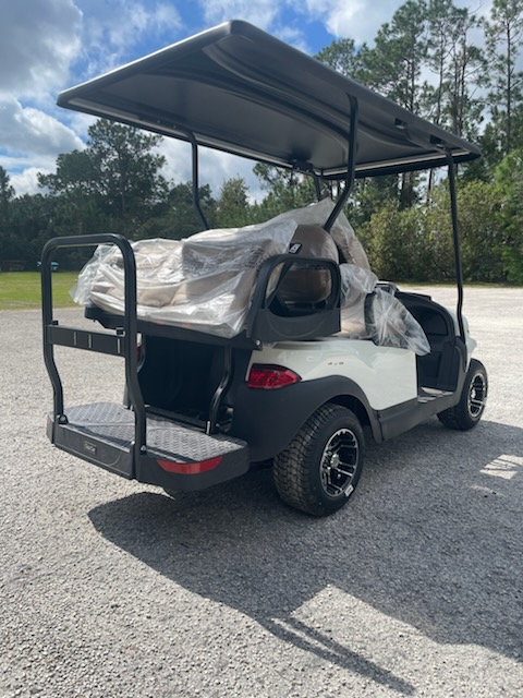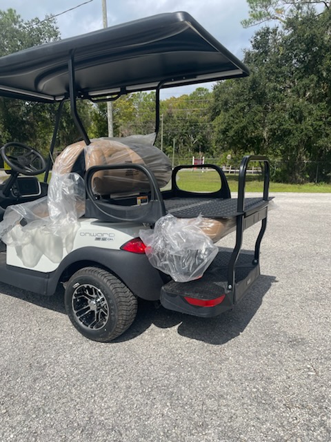 New 2026 Club Car Onward 4 passenger, non-lifted, High Performance Lithium Ion, color: Metallic Glacier White, seats: Premium Camello, top: Long Black, passenger side front canopy grab handle, factory LED light kit with running lights, turn signals, hazards, horn, dual USB, state of charge meter, front cup holders, Instrument Panel with 7″ digital display, Upper Screen Center Storage Glove Box, Lower Center Storage with LH & RH Wireless Charger, Driver Side and Passenger Side Storage Glove Box, Consumer premium comfort grip steering wheel, Uncommon Key:1B, 10″ 0-offset Mercury wheel – 205/55-10 Loadstar tires – Gloss Black and machined and charger. $14,972.00