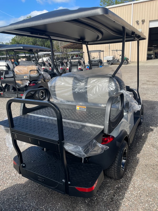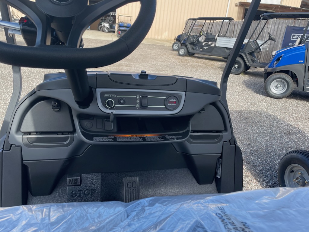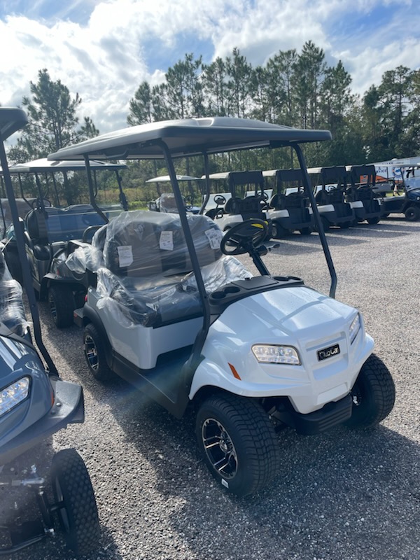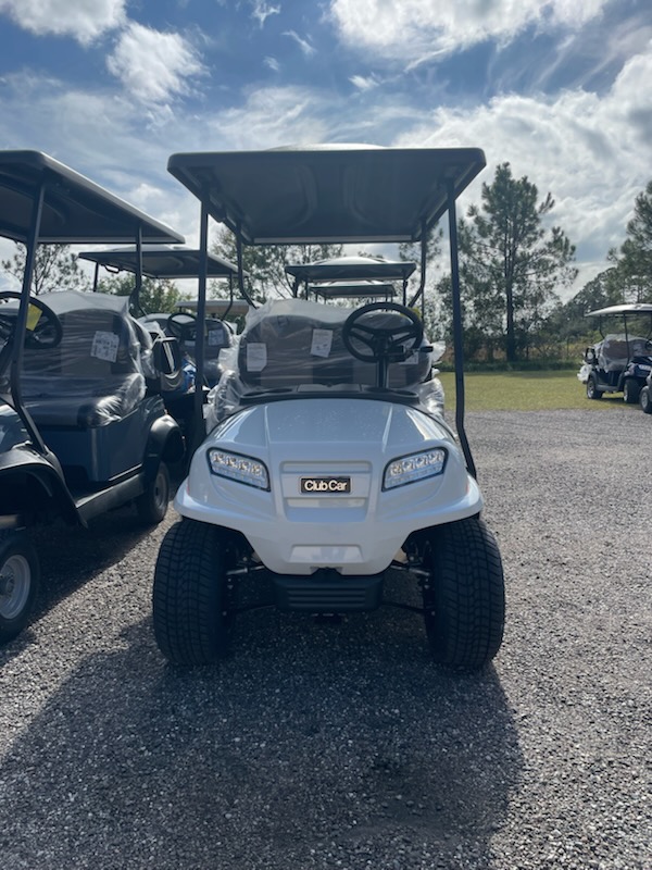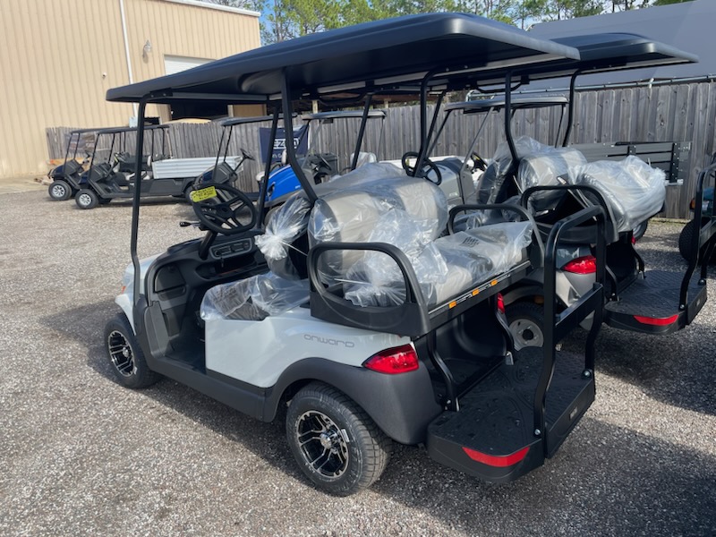 New 2026 Club Car Onward 4 passenger, non-lifted, Standard Electric System (Trojan T-875) SPWS*, color: Metallic Glacier White, seats: Premium Black / Grey, top: Long Black, passenger side front canopy grab handle, factory front LED headlights with LED accent running lights, rear LED tail & brake lights, front & rear turn signals, state of charge, horn, USB, front cup holders, Standard Instrument Panel, Upper Center Storage Glove Box, Lower Center Storage with LH & RH Wireless Charger, Driver Side and Passenger Side Storage Glove Box, Consumer premium comfort grip steering wheel, Uncommon Key:1A, 10″ 0-offset Mercury wheel – 205/55-10 Loadstar tires – Gloss Black and charger.