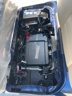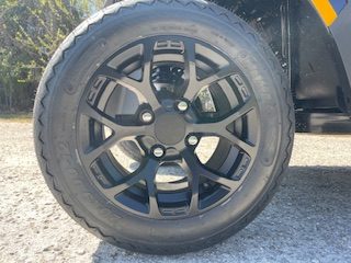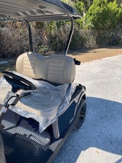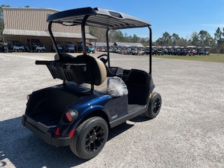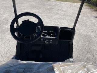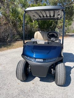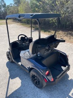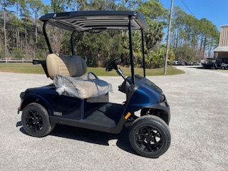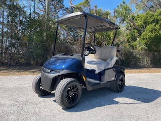 New 2026 E-Z-GO RXV 2 passenger, ELiTE 2.2 Single Pack Lithium Ion color: Patriot Blue, seats: Premium Mushroom, top: 54″ Black, factory Premium LED light kit with turn signals, hazards, horn, USB A & C, state of charge, front cup holders, premium steering wheel, sweater basket, 180 convex rearview mirror, 20×9-in Hole-N-One 4ply 12″ Force Satin Black, and Charger.