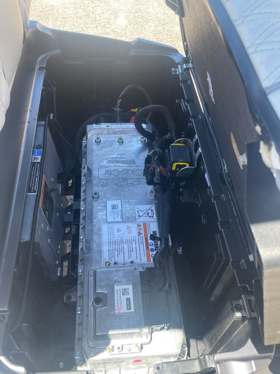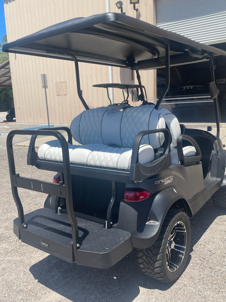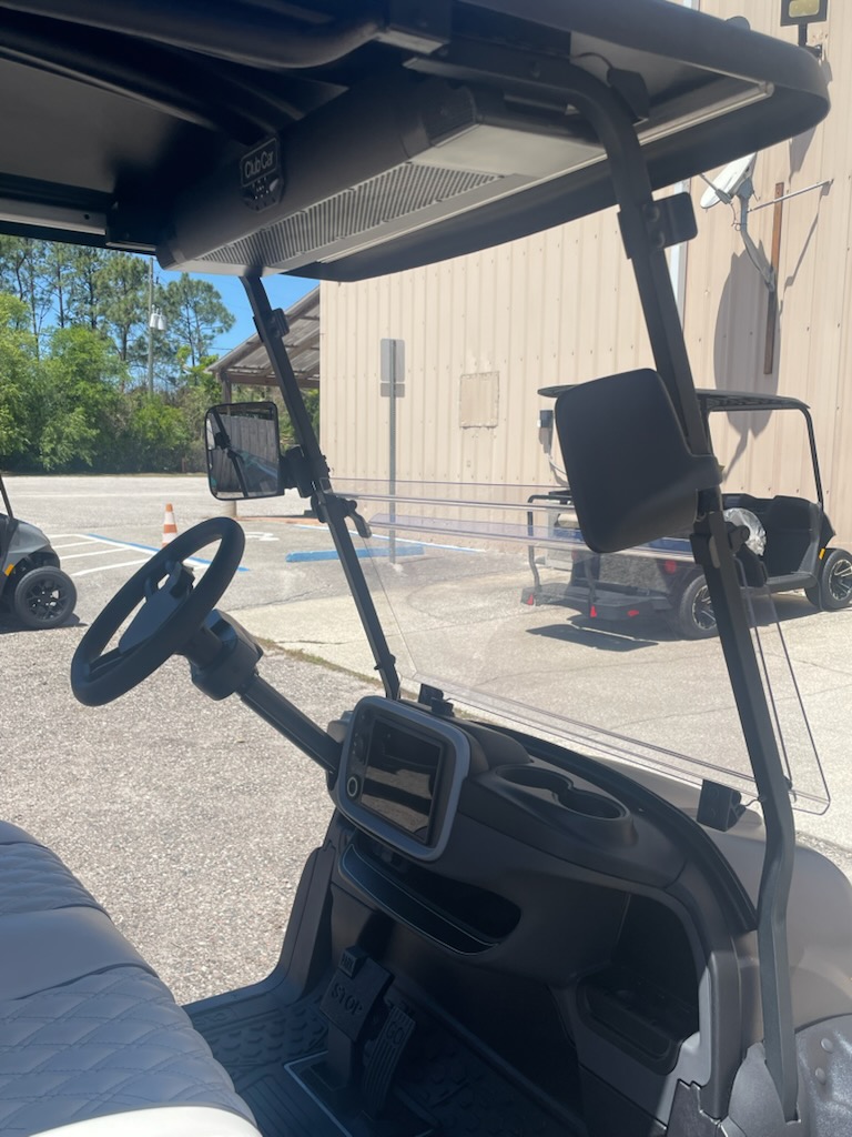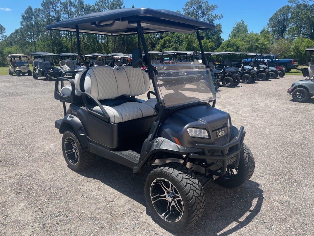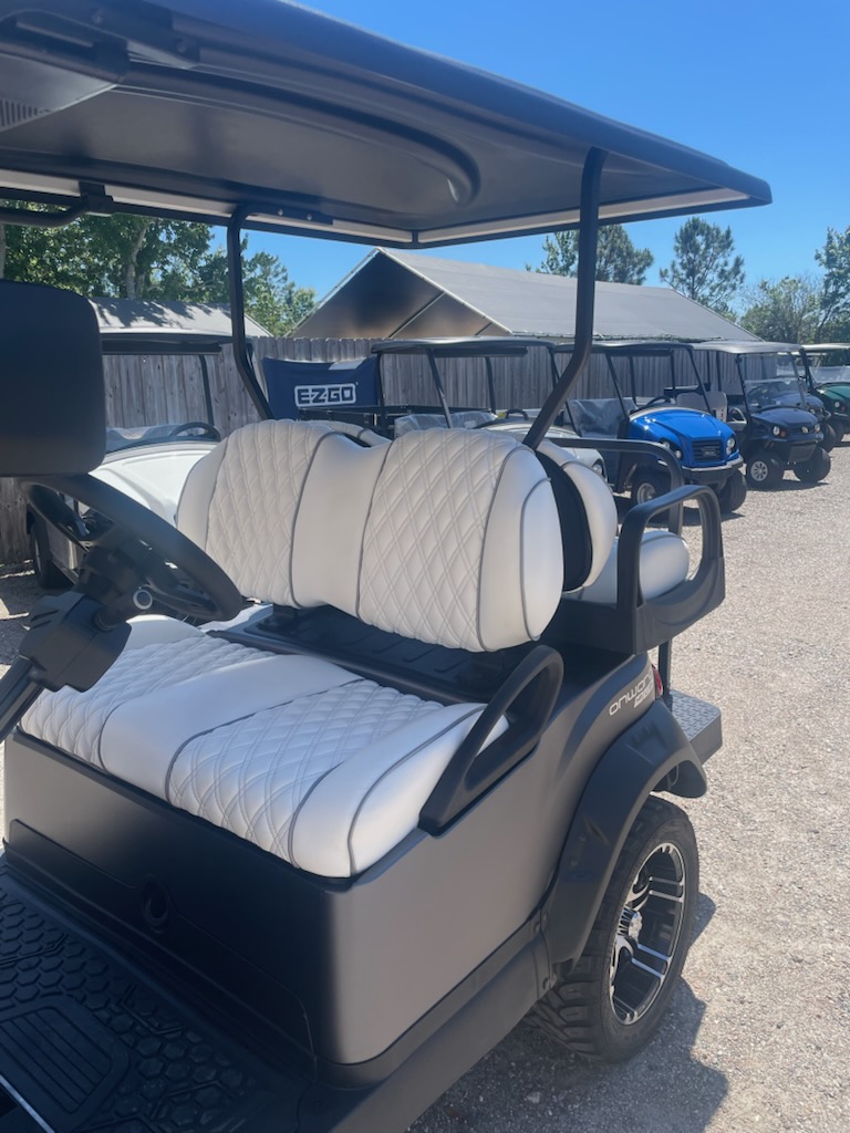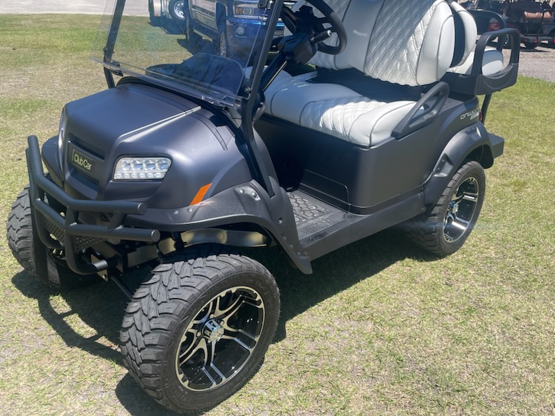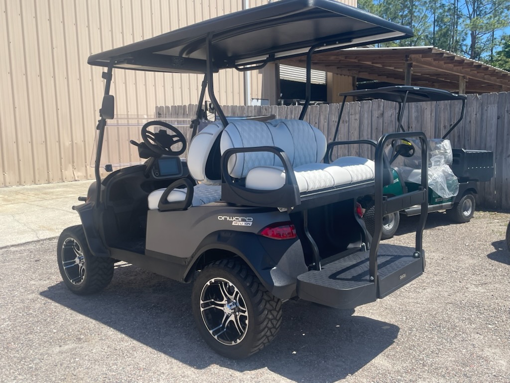 New 2027 Club Car Onward 4 passenger, Lifted, High Performance Standard Range Lithium Ion, color:Matte Graphite, seats: Premium Elite Bright White Seat with Double-Diamond Silver Rush Stitching and Piping, canopy : Black with passenger side front canopy grab handle, clear premium folding windshield, side folding mirrors, Factory front LED headlights with LED accent running lights, rear LED tail & brake lights, front & rear turn signals, state of charge meter, horn USB-A USB-C, front cup holders, premium comfort grip steering wheel, Instrument Panel with 7″ Digital Display, Upper Center Storage Screen Glove Box, Lower Center Storage LH & RH Wireless Charger, Standard Side Storage, Front & Rear Fender Flares, 14″ Gloss Black and Machined Mercury wheel with 215/50R-14 Steel-Belted Radial Klever Tire, premium heavy duty floormat, brush guard, uncommon key:1A , bluetooth soundbar, grill insert, and charger. $15,087.00