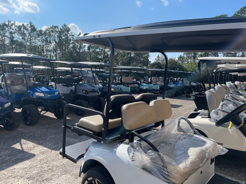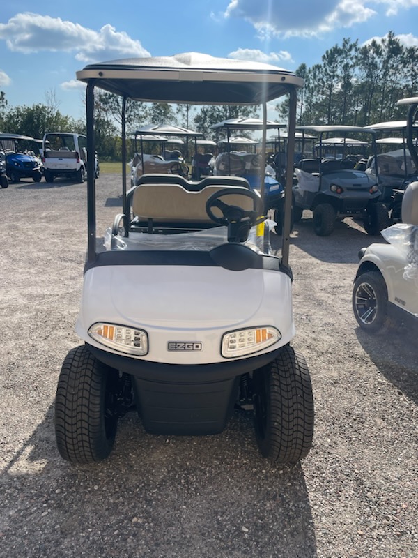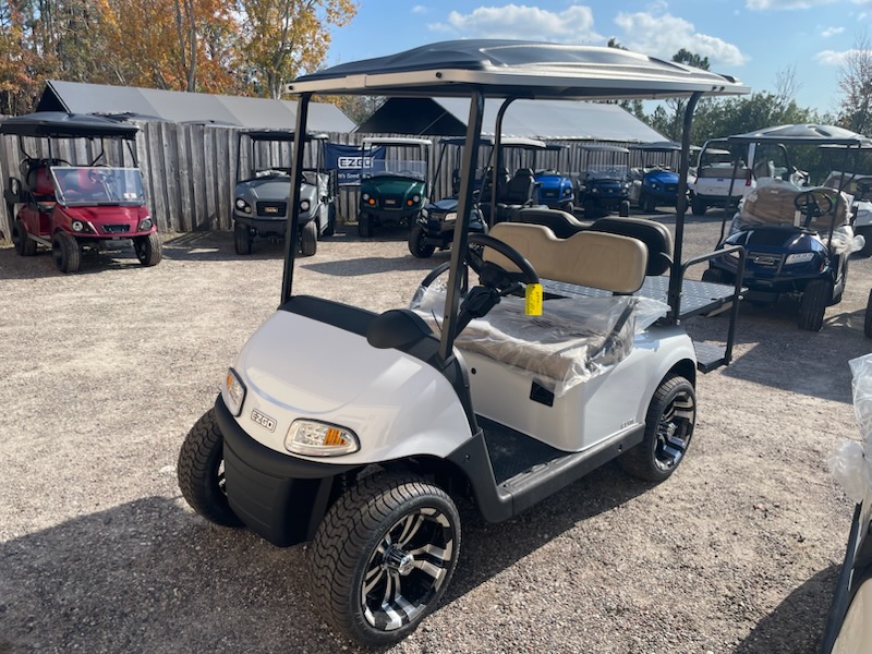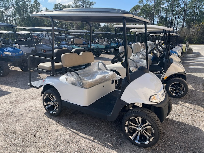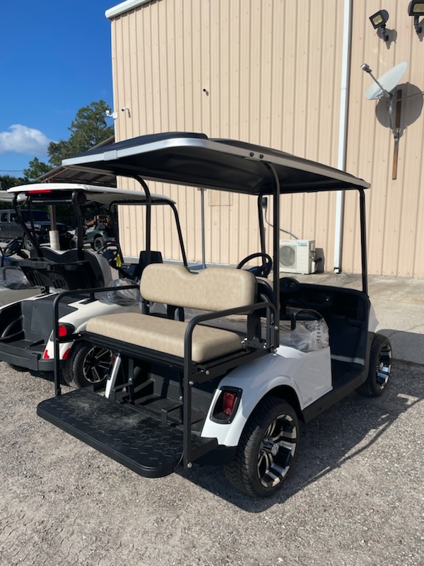 Refurbished 2021 E-Z-GO RXV ELiTE 2.0 Lithium Ion, 4 passenger, color: White, seats: Standard Beige, Long Black, headlights, taillights, brake lights, turn signals, horn, key:213, USB, state of charge meter, front cup holders, 205/40-14 tires with 14″ aluminum wheels and charger. $8,695.00