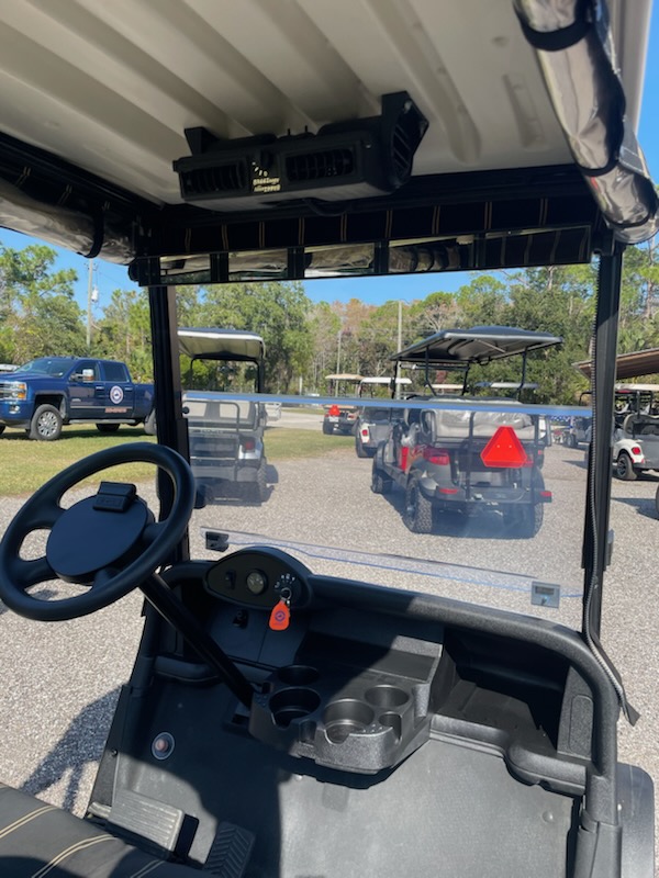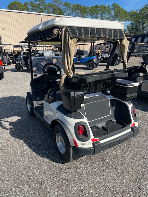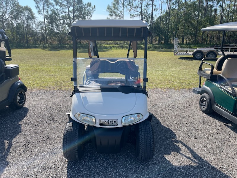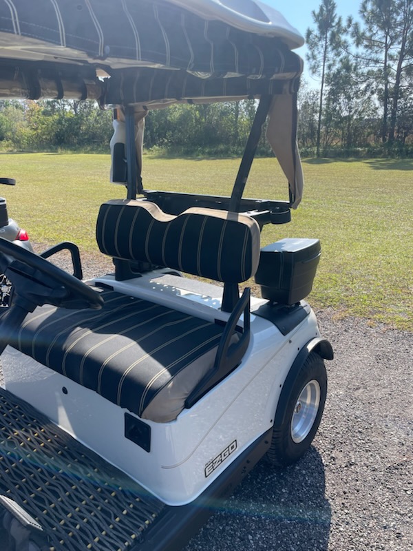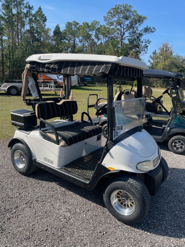 Used 2009 E-Z-GO RXV 2 passenger, non-lifted, Electric (New Batteries) color: Ivory with gold pinstriping, standard seats with sunbrella covers, oyster top with Sunbrella curtain package, sweater basket, golf bag holders, clear windshield, 5 panel mirror, fan, halogen head lights, tail lights, state of charge meter, horn, key:213, cup holders, driver side glove box door, steering wheel with scorecard clip, driver side sand bucket, passenger side cooler, 205/65R10 GTW Fusion SR, fender flares and charger. $4,754.00