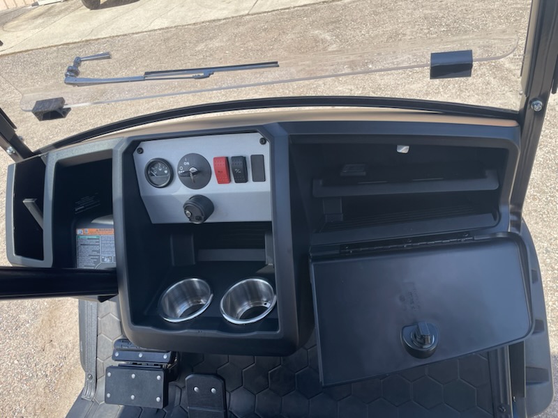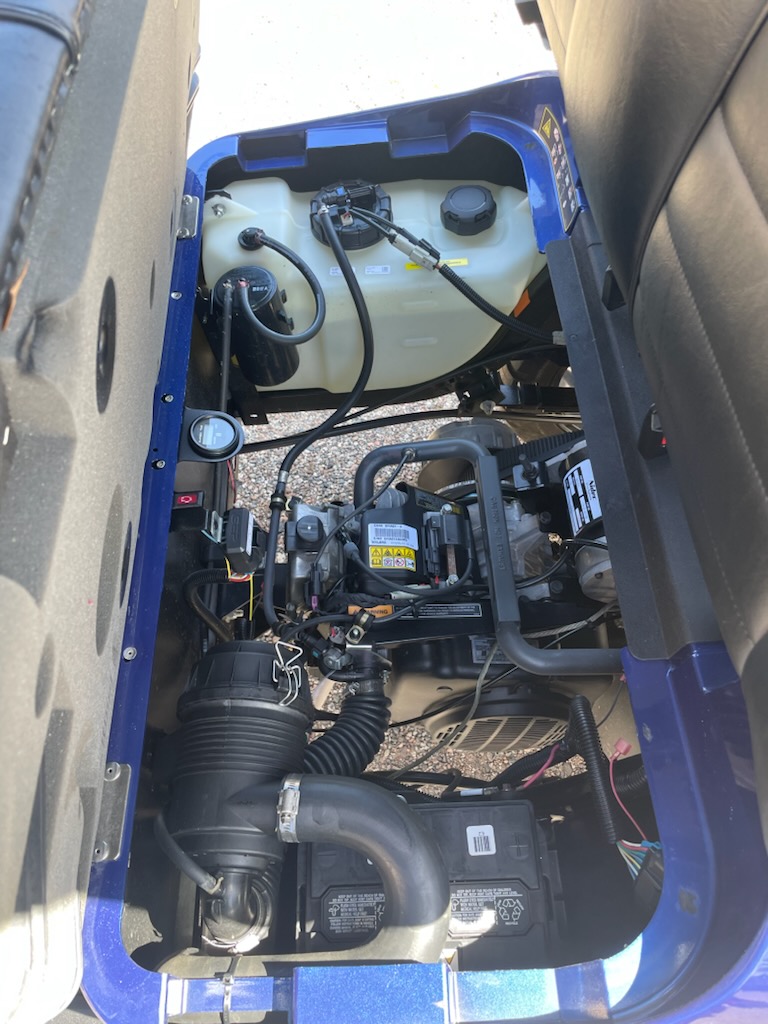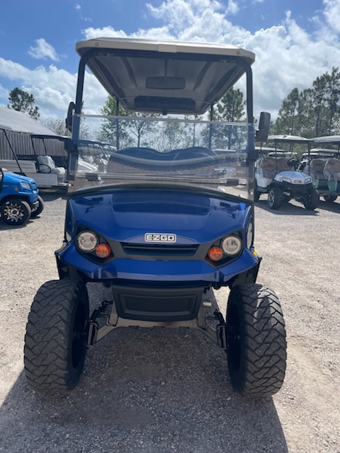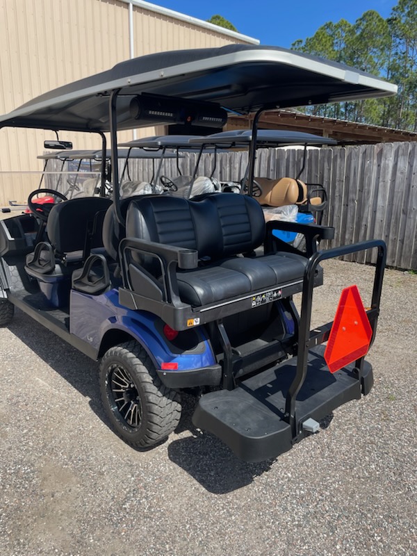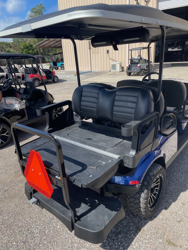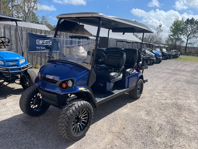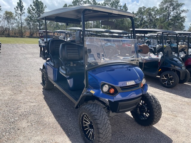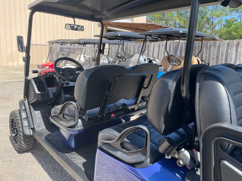Used STREET LEGAL 2022 E-Z-GO, L6, Gas, 6 passenger, Lifted, color: Electric Blue, seats: Premium Black, long black top, LED head lights, tail lights, brake lights, turn signals, horn, dual USB, front cup holders, fuel meter, hour meter (34.5 hours) Key: 401, glovebox, DOT windshield, wiper, side folding mirrors, rear view mirror, seat belts, smv, license plate light, middle row grab bar, RFS rear seat kit with storage bucket and armrest cup holders, bluetooth sound bar and 14″ wheels. $13,995.00 + Tax, Tag, Title.