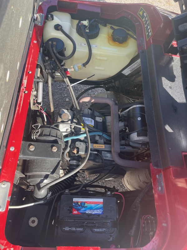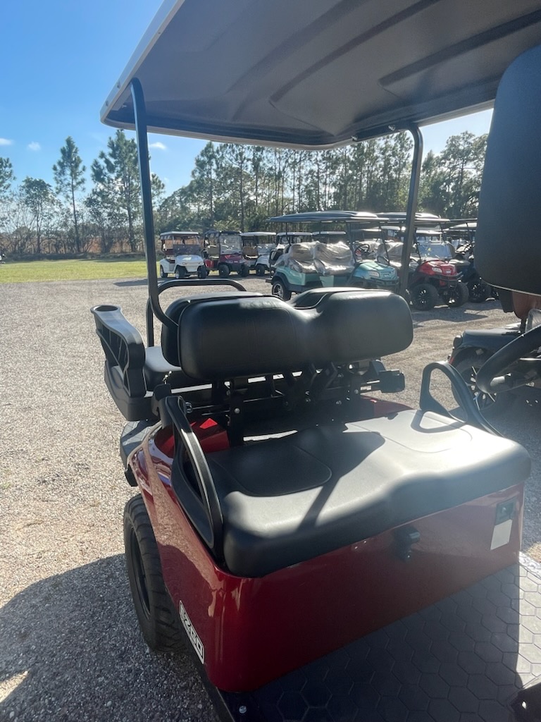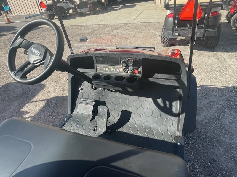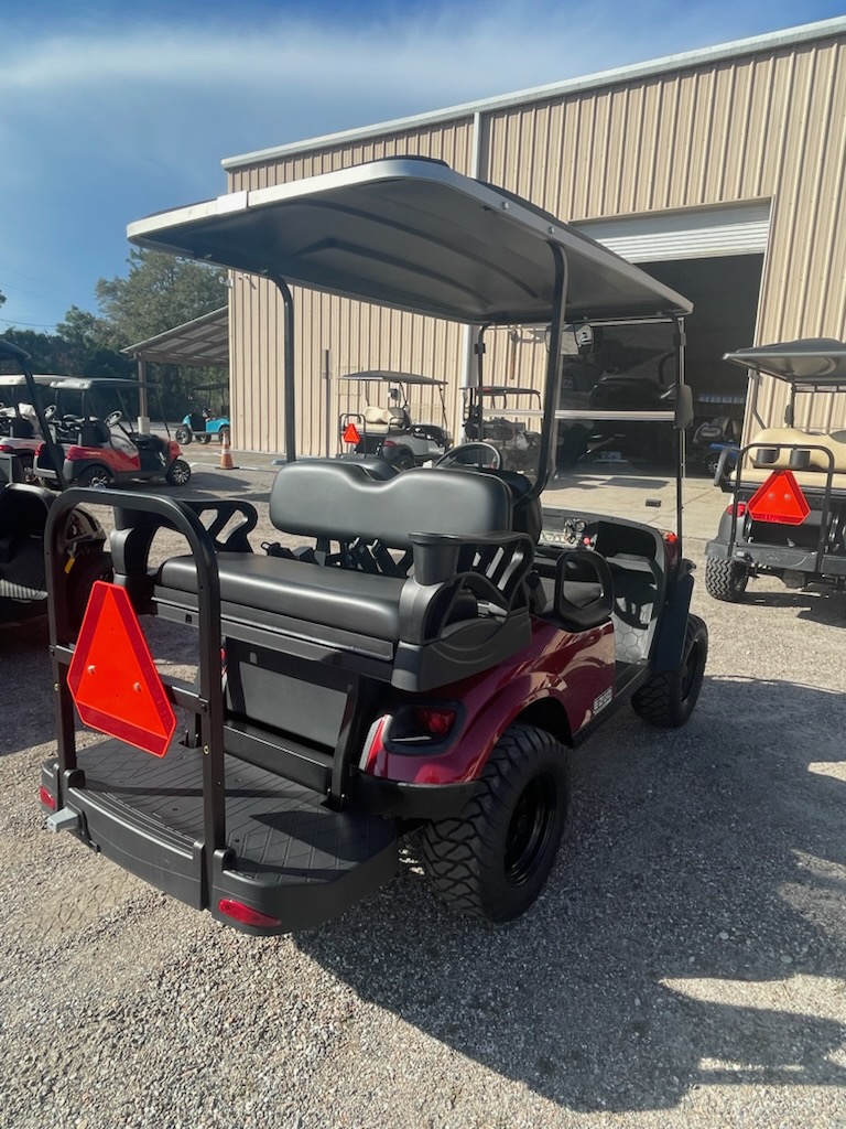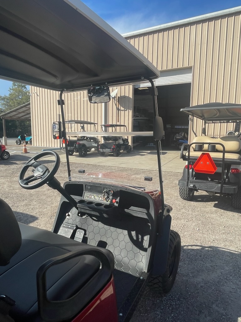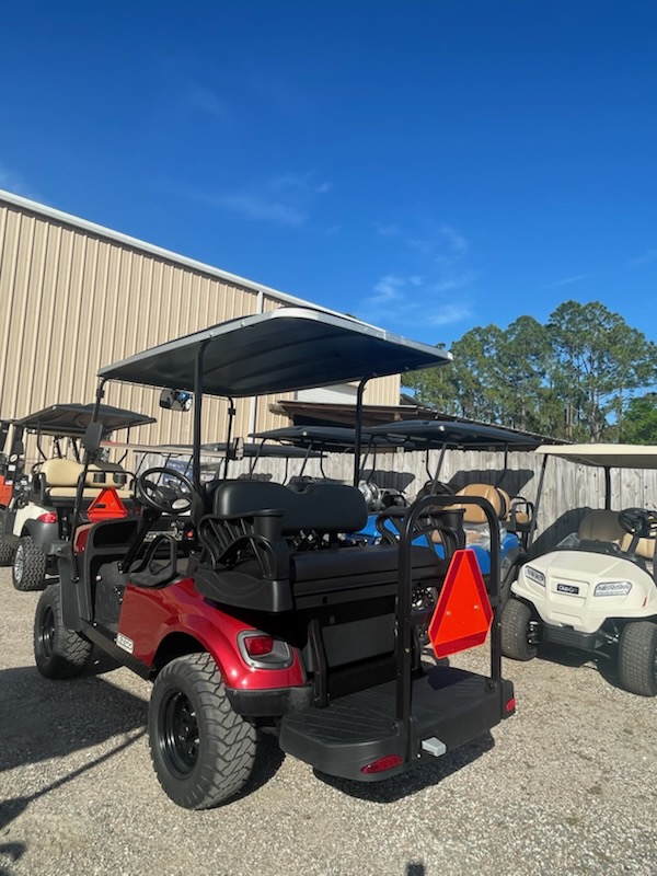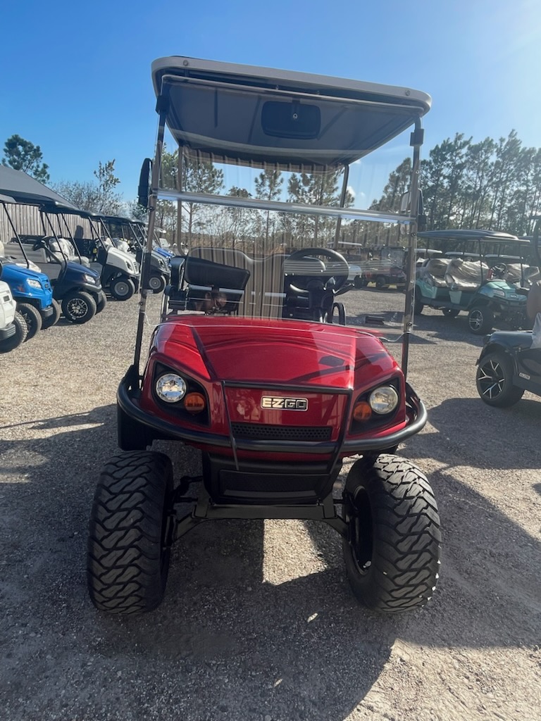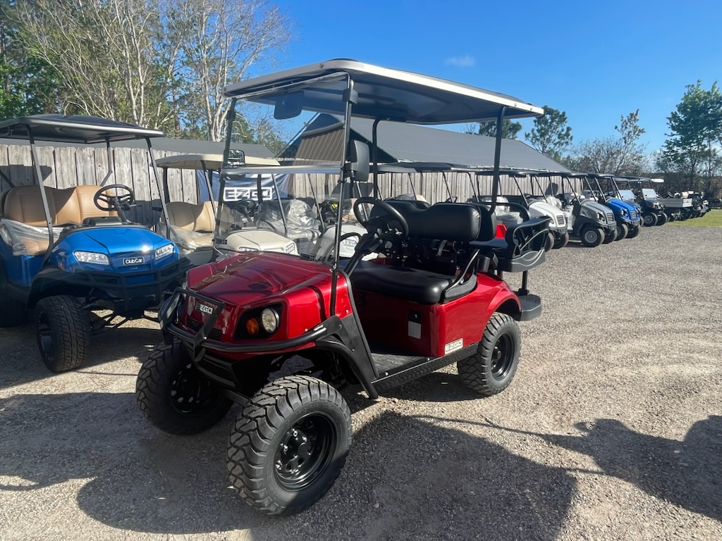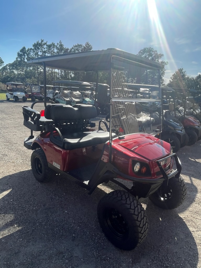 Used STREET LEGAL 2016 E-Z-GO S4 Gas, 4 passenger, Lifted, color: Red, seats: Black, top: Black Long, DOT windshield, wiper, mirrors, seat belts, SMV, license plate light, head lights, tail lights, turn signals, reflectors, horn, fuel meter, front cup holders, rear storage bucket, rear cup holders in armrest, front fender flares, 23x10R-12 Black Steel Wheels and brush guard. $6,995.00 + Tax, Tag, Title.